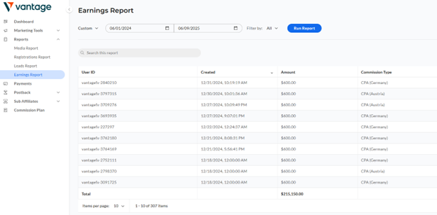 If you refer other affiliates to the Vantage program, this section shows their performance and contribution to your sub-affiliate earnings.