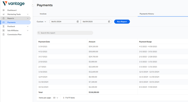 The Payments section displays your complete payment history, including dates, amounts, and status. It offers full transparency over your payouts.