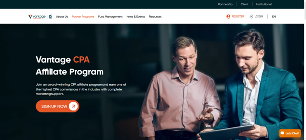 Head to the Vantage CPA Affiliate Program page to sign up for an account.
