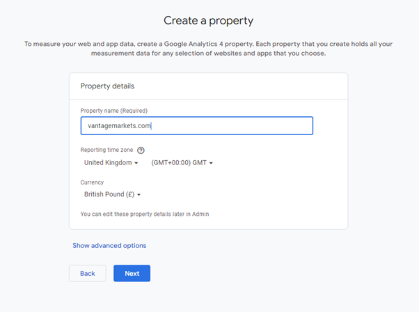 To make a Universal Analytics Property along with GA4 analytics property, click on the “Show Advanced Options”.