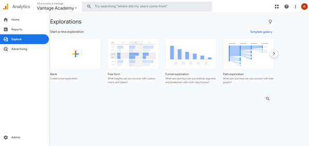 You can access Exploration reports in Google Analytics 4 on the left side of the screen.