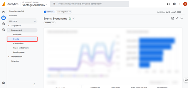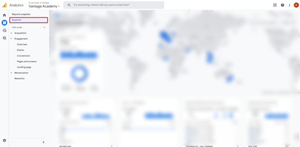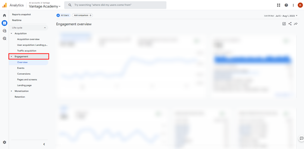 You can access the different Engagement reports in Google Analytics 4 on the left side of the screen.