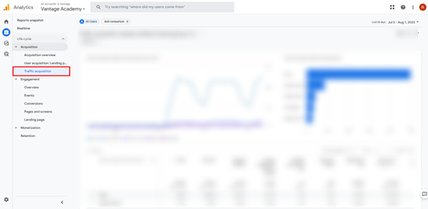 You can access the Traffic acquisition report in Google Analytics 4 on the left side of the screen.