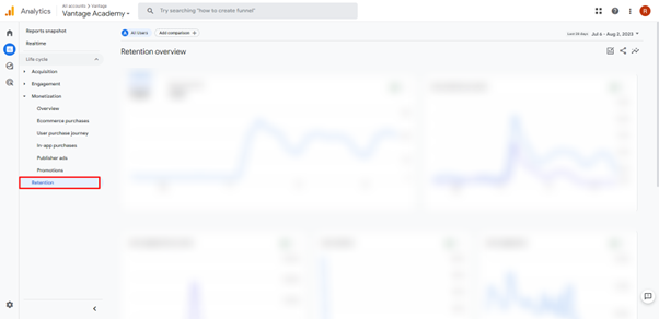 You can access the Retention report in Google Analytics 4 on the left side of the screen.